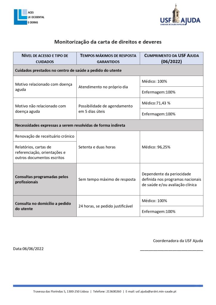Respeitando a Carta de Direitos de Acesso aos Cuidados de Saúde pelos Utentes do Serviço Nacional de Saúde e com o intuito de promover a melhor acessibilidade dos utentes aos serviços da USF Ajuda, são realizadas trimestralmente auditorias aos Tempos Máximos de Resposta Garantidos (TMRG) previstos na portaria nº153/2017, de 4 de maio.